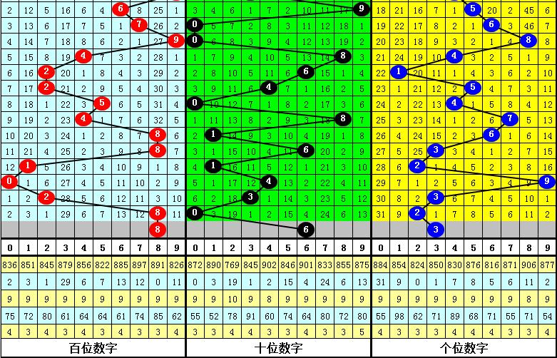 从以上统计可以看出,百十位两码合差8与8同时出现之后其下期两码合差表现最热的4个分别为:1249,本期百十位两码合差可以参考这四码中的数据。