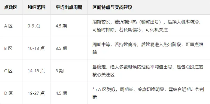 不同和值包含的号码数量不同,出号概率也有差异。将和值划分为 4 个点数区,结合各区间的 “平均出点周期”,可精准判断冷热趋势: