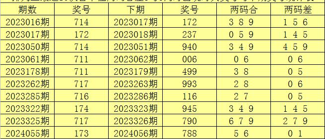 排列三第2024096期奖号两码合差分析: