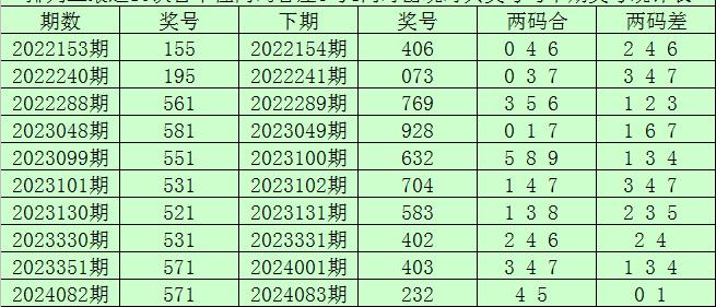 百个位合差分析:上期奖号百个位开出15组合,两码合为6,两码差为4,最近10次百个位两码合6与两码差4同时出现时,其奖号和下期奖号分别为: