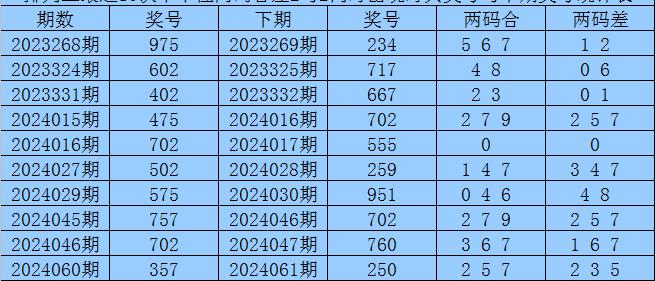 从以上统计可以看出,十个位两码合差2与2同时出现之后其下期两码合差表现最热的4个分别为:0127,本期十个位两码合差可以参考这四码中的数据。