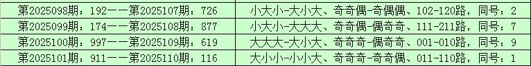 统计排列三已开出的奖号发现,在连续5期(第2025097期-第2025101)奖号为:171-192-174-997-911。