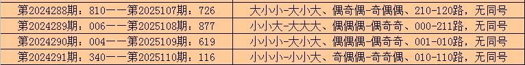 所以,排列三第2024292期奖号:030,与排列三第2025111期奖号可能没有同号。且排列三第2025111期奖号大小比、奇偶比和012路比不会与第2024292期奖号直选形态:小小小、偶奇偶和000路全部相同。