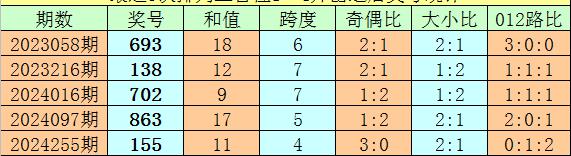 1、排列三最近两期百位号码分别开出1和4,历史上百位号码连续两期分别开出1和4的奖号出现了55期。前五期开出之后其下期奖号分别为:693、138、702、863、155;