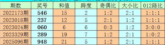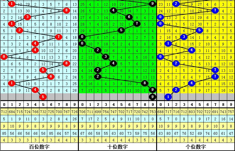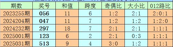 3、在以上0-9号码频次中,号码大小比为27:27,012路比为21:20:13,本期预计百位开出2路号码,参考号码5。