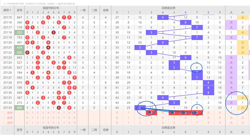 通过观察跨度及跨度属性走势可以发现:近10期内跨度小数号码出号数量少于大数号码,可见近期跨度更容易开出大数号码,上期跨度开出了小数号码2,本期跨度大数号码出号可能性高于小数号码,因此本期跨度应该主要考虑大数号码出号;再结合上述走势图看,本期跨度看好567,防邻号3等号码。