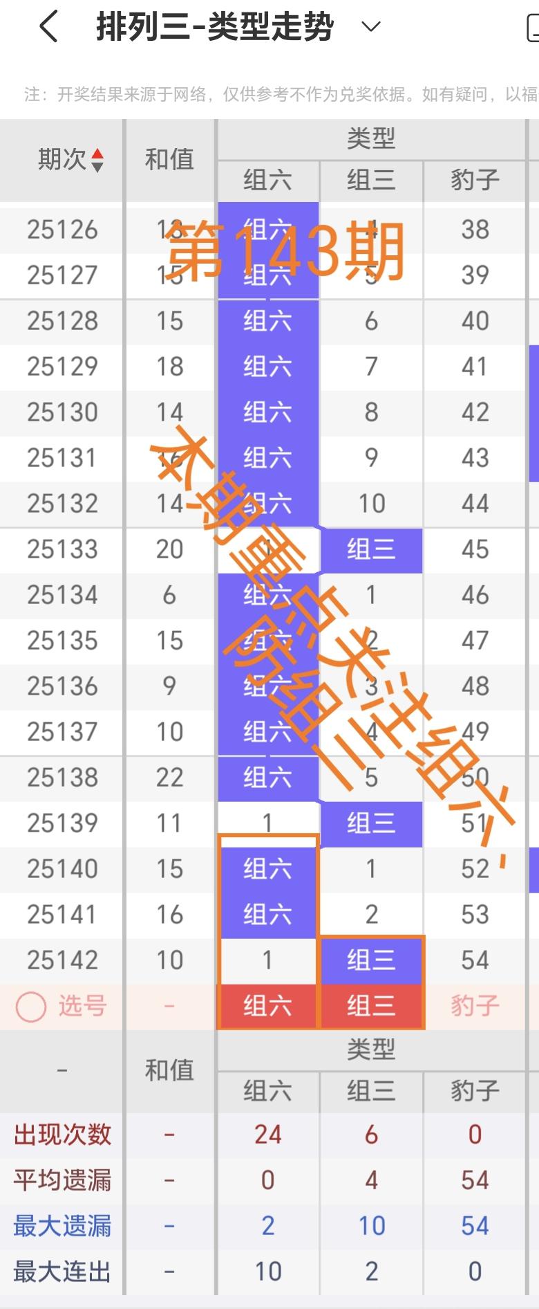 >从近三十期的走势来看,形态组六出现了24次,平均遗漏次数为0;形态组三出现了6次,平均遗漏次数是4次;形态豹子出现了0次,平均遗漏次数为54次,上期开出的形态是组三。本期重点关注组六形态,其次防备组三形态