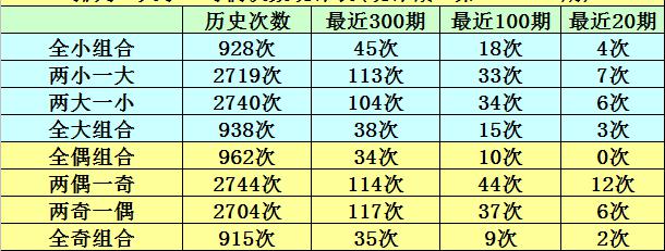 大小形态判断:最近5期小 号出现个数分别为:0-1-1-3-3,大号开出个数分别为:3-2-2-0-0,总大小比为7:8,大小 号码走势持平;