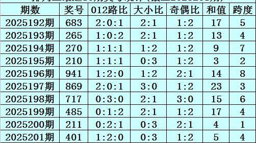 上期回顾:排列三2025201期奖号为401,奇偶比为1:2,大小比为0:3,跨度为5。