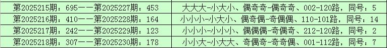 统计排列三已开出的奖号发现,在连续5期(第2025214期-第2025218)奖号为:176-695-410-242-307。