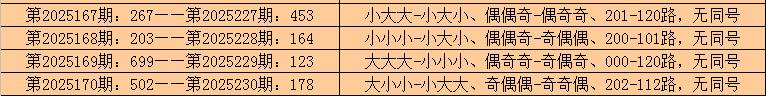 所以,排列三第2025171期奖号:105,与排列三第2025231期奖号可能没有同号。且排列三第2025231期奖号大小比、奇偶比和012路比不会与第2025171期奖号直选形态:小小大、奇偶奇和102路全部相同。