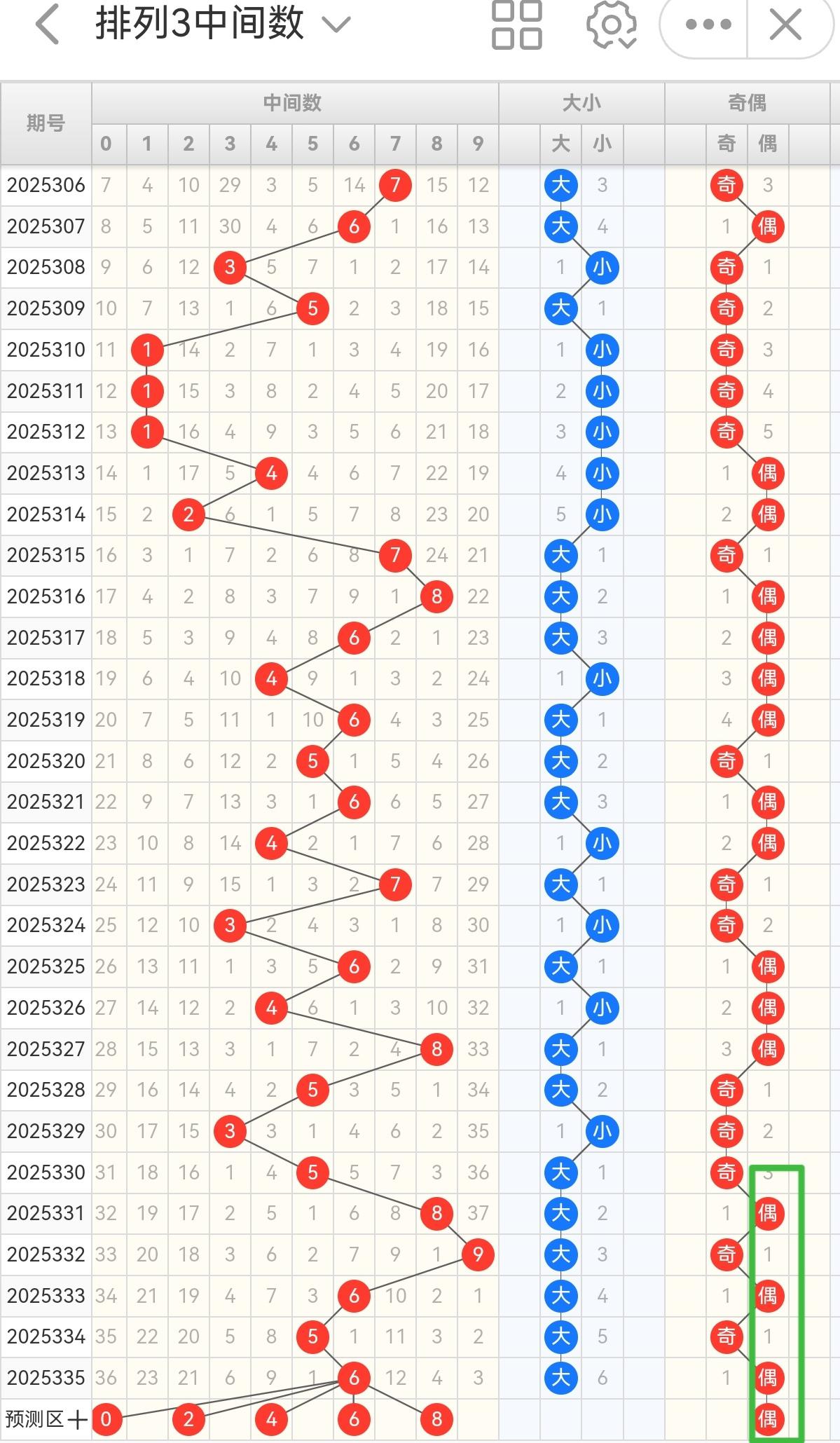2、中间数:336期中间数6,从近30期数据看,在奇偶走势中,偶数当前已经连续2次是单出的,通过对比近100期数据发现,本期偶数连出回补概率增大。所以,结合出号趋势,本期中间数关注02468。