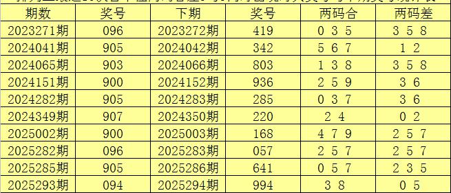 百十位合差分析:上期奖号百十位开出90组合,两码合为9,两码差为9,最近10次百十位两码合9与两码差9同时出现时,其奖号和下期奖号分别为: