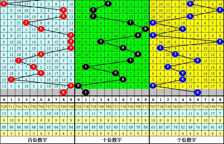 在十位前9次出现号码0后,其下期奖号分别开出:7-6-8-9-4-8-4-4-7,其中奖号个数大小比是6:3,012路比是2:5:2,奇偶比是3:6。