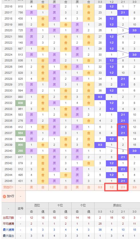 上期质合比:2:1,近10期质合比出现情况:2:1、2:1、1:2、0:3、3:0、2:1、1:2、2:1、1:2、2:1,最近10期出现5期2:1,出现3期1:2,出现1期0:3,出现1期3:0,根据近10期规律本期推荐连出2:1,防隔期出1:2,综上所述质合比推荐:防:1:2,重点关注:2:1。