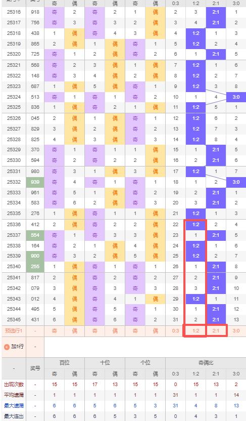上期奇偶比:2:1,近10期奇偶比出现情况:1:2、2:1、1:2、1:2、2:1、2:1、2:1、1:2、2:1、2:1,最近10期出现6期2:1,出现4期1:2,出现0期0:3,出现0期3:0,根据近10期出号规律本期推荐三连出2:1,防遗漏2期出1:2,综上所述奇偶比推荐:防:1:2,重点关注:2:1。