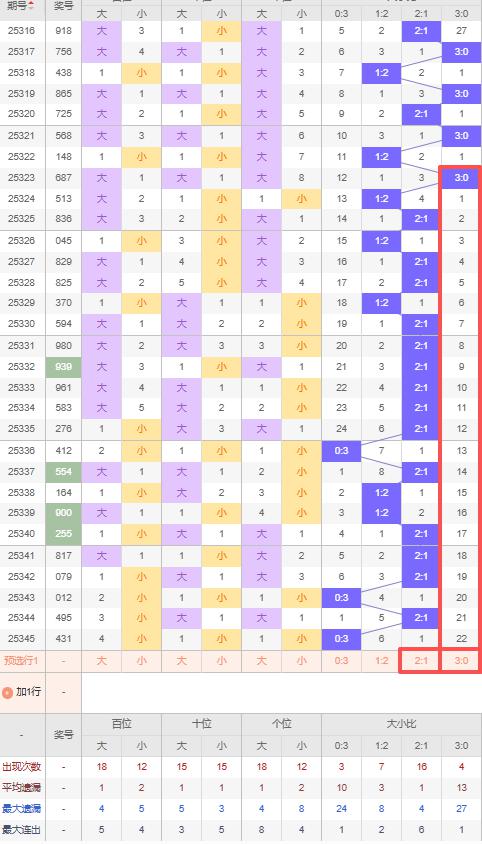 上期大小比:0:3,近10期大小比出现情况:0:3、2:1、1:2、1:2、2:1、2:1、2:1、0:3、2:1、0:3,最近10期出5期2:1,出现2期1:2,出现3期0:3,出现0期3:0,根据近10期出号规律本期推荐隔期出2:1,防遗漏22期出3:0,综上所述大小比推荐:防:3:0,重点关注:2:1。