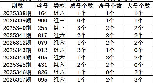 上期回顾:排列三第2025347期开奖:695,质合比为1:2,奇偶比为3:0,大小比为2:1。