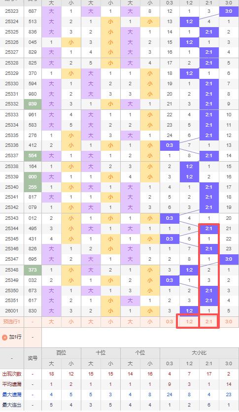 上期大小比:1:2,近10期大小比出现情况:0:3、2:1、0:3、2:1、3:0、1:2、0:3、2:1、2:1、1:2,最近10期出4期2:1,出现2期1:2,出现3期0:3,出现1期3:0,根据近10期出号规律本期推荐隔期出2:1,防连出1:2,综上所述大小比推荐:防:1:2,重点关注:2:1。