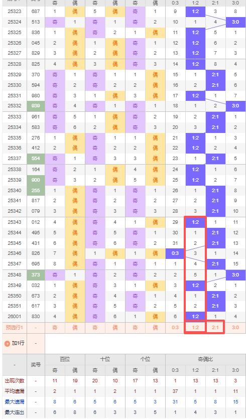 上期奇偶比:1:2,近10期奇偶比出现情况:1:2、2:1、2:1、0:3、2:1、3:0、1:2、2:1、2:1、1:2,最近10期出现5期2:1,出现3期1:2,出现1期0:3,出现1期3:0,根据近10期出号规律本期推荐隔期出2:1,防连出1:2,综上所述奇偶比推荐:防:1:2,重点关注:2:1。