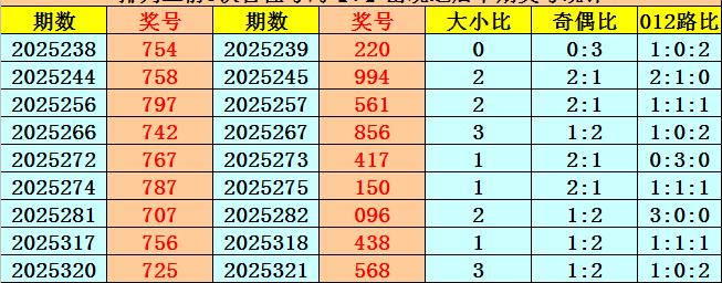 百位号码:百位上期奖号为1路、偶数、大号:7,历史上百位号码7共开出724期,前一次开出期数在第2025320期,上期奖号隔36期再次开出。