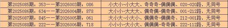 所以,排列三第2025089期奖号:208,与排列三第2026007期奖号可能没有同号。或者排列三第2026007期奖号大小比、奇偶比和012路比可能与第2025089期奖号直选形态:小小大、偶偶偶和202路不全部相同。