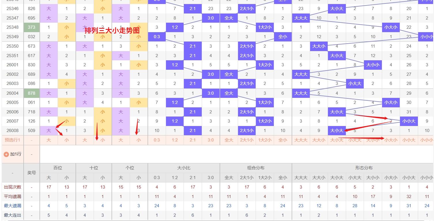 排列三 大小形态分析:从大小走势图上可以看出排列三100期内百位大小比约为55比45,十位大小比约为47:53,个位大小比约为52比48,除了个位和百位奇数比偶数多,十位偶数比奇数多。历史数据近2期开出大小大下一期的走势为,第282期开出大小大第283期开大大小。第295期开出大小大后第296期开小大大,第304期开出大小大后305期开大小小。近期排列三大小走势中,大大小形态持续热出,形成明显强势区间,短期内需重点防范其继续连下;与此同时,大小小形态已进入较冷遗漏阶段,从形态轮动平衡的角度看,存在较强的反弹可能性。这种热态延续与冷态回补并存的格局,所以排列三第2026009期大小形态推荐大小小防大大小。本文由为彩网钱是生命动力所著,请勿转载