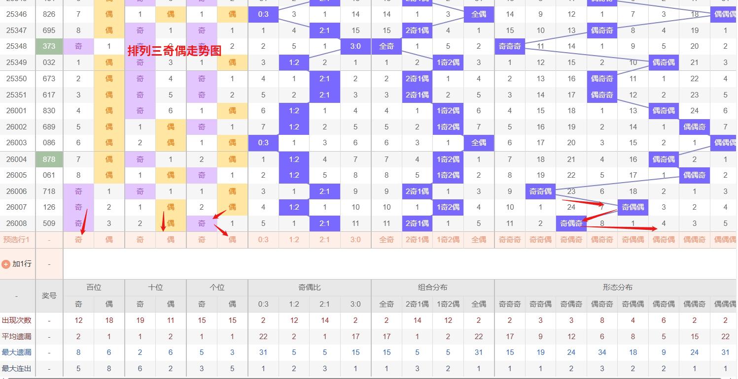 排列三 奇偶分析:从上图可以看出排列三100期内百位奇偶比约为48比52,十位奇偶比为51比49,个位奇偶比为55比45,十位的比值比较均衡,但是个位的比值偏差就有点大,历史奇偶形态近2期开出奇偶奇后下一期的走势为,第272期开出奇偶奇后273期开偶奇奇, 第285期开出奇偶奇后第286期开奇偶偶,第307期开出奇偶奇后第308期开偶奇偶,近期排列三奇偶走势中,偶奇奇与偶奇偶形态持续热出,呈现明显的双形态轮动热度。从走势惯性看,此类热态组合往往具有连下倾向,短期内需重点防范其继续走强。历史数据显示,当特定奇偶形态形成热点时,常会延续一段时间直至达到均衡阈值。因此当前阶段以追踪热态为主,重点关注偶奇奇与偶奇偶的交替或连续出现,所以排列三2026009期奇偶形态推偶奇奇与偶奇偶。本文由为彩网钱是生命动力所著,请勿转载