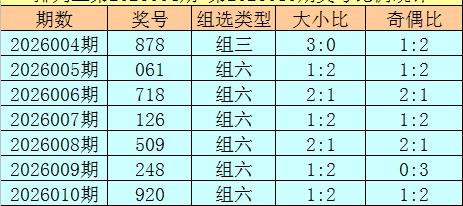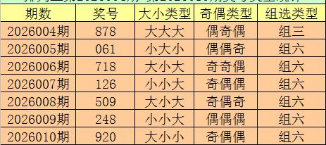 排列三第2026010期回顾:奖号920,奇偶比1:2,大小比1:2,和值11,类型:组六。