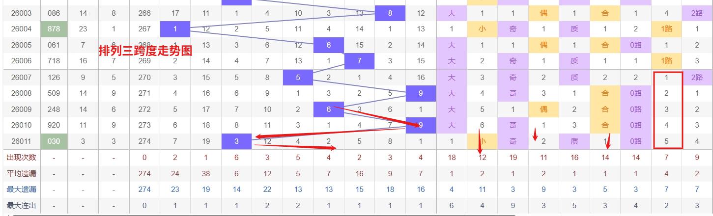 排列三 跨度分析:从上图可以看出近100期的跨度大小比约为51比49,跨度奇偶比约为47比53总体来看还是比较均衡的,但跨度大小之间有点差异。我们再从历史开出3跨后下一期8跨度数据来做参考。最近10期跨度大小比约为6:4期开出大数跨度过多返回小数跨度的概率更高一点。历史开奖近2期出3跨以后的走势为287期开出3跨后下一期走5跨走出2振幅,第294期开出3跨后下一期走7跨走4振幅第305期开出3跨后下一期开出8跨走出5个振幅。连续多期大振幅,近期排列三跨度走势分析,5跨作为持续走热的热号,其活跃态势明显,短期内存在惯性延续的可能,需重点防范其连开或持续高位表现。与此同时,2跨已进入长期遗漏的冷态区间,从概率回补与冷热转换的规律来看,任何冷号都无法持续遗漏,尤其在热号吸引大部分关注时,冷号悄然解冻的风险正在增加,因此对2跨的回补须保持警惕。出3跨度后容易走出2到5个跨度振幅的对称形态,跨度走出2到5个振幅看好的跨度有2578跨,所以第2026012期排列三跨度推荐2578跨。