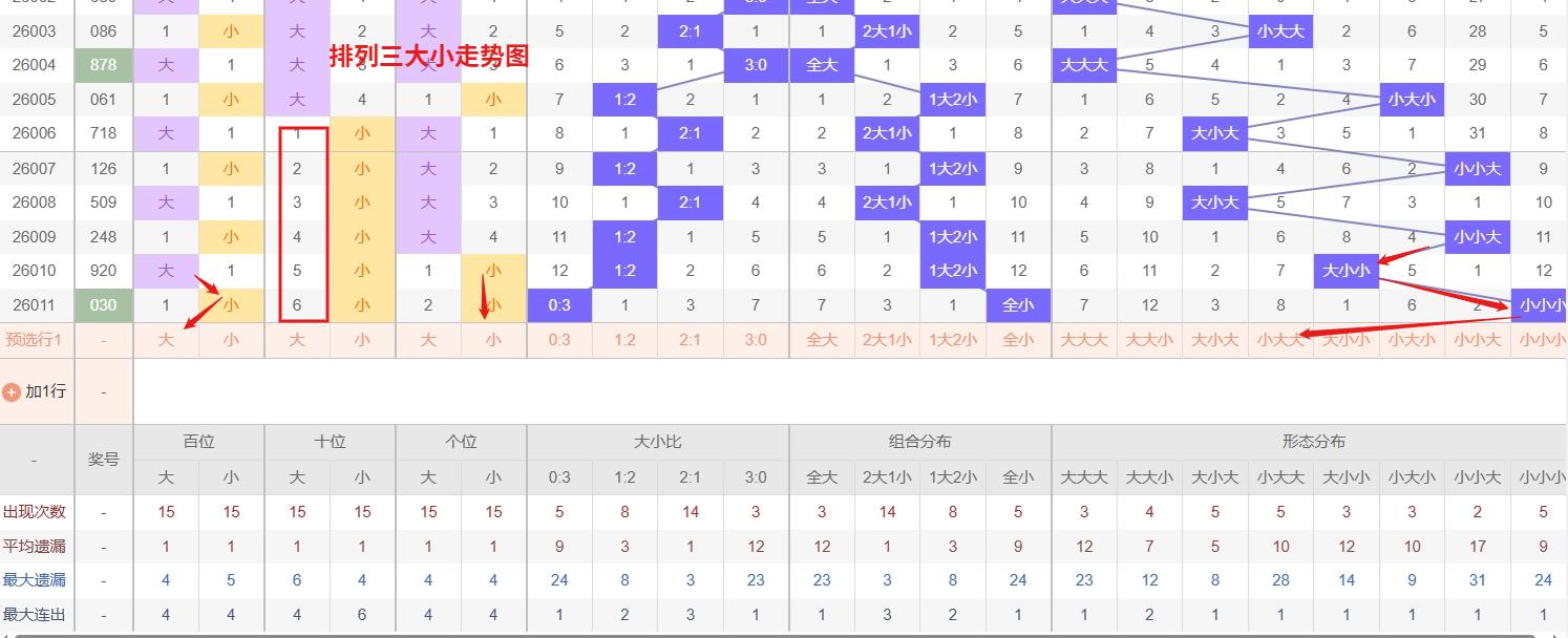 排列三 大小形态分析:从大小走势图上可以看出排列三100期内百位大小比约为47比53,十位大小比约为46:54,个位大小比约为51比49,除了个位奇数比偶数多,十位和百位偶数比奇数多。历史数据近2期开出小小小下一期的走势为,第285期开出小小小第286期开大大小。第294期开出小小小后第295期开大小大,第307期开出小小小后308期开小大小。近期排列三大小走势分析,“小大小”目前处于温态,但出现频率有所上升,走势图上呈现蓄力上行的态势,通常这类温号在积累一定动能后,有较大概率转为热号,值得密切关注其后续发展。另一方面,“小大大”近期表现强势,已形成明确的热态格局,热号往往具有惯性延续的特征,短期内仍有较大概率开出,所以排列三第2026012期大小形态推荐大大小防小大小。