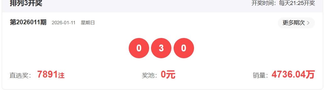 排列三第2026011期开奖回顾:开奖号码:030 形态:组三