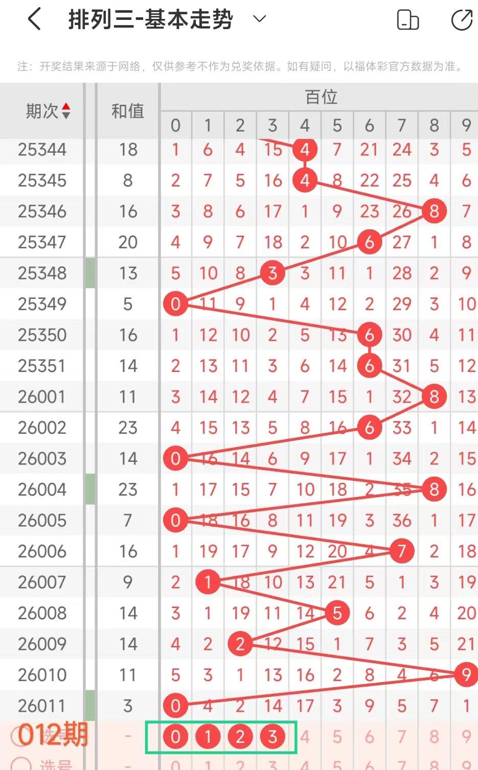 经统计0号出现12次、1号出现7次、2号出现2次、3号出现6次、4号出现6次、5号出7次、6号出现8次、7号出5次、8号出现5次、9号出现5次.统计后出现次数靠前的数字作为我们的备选号码.其号码有01346等