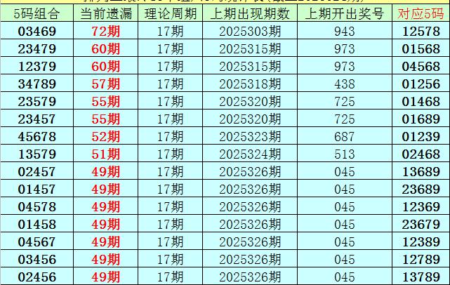 (5)排列三目前遗漏值最大的5码组六组合为:03469,本期遗漏72期,短期解冻的可能性较小,则26025期奖号分布在03469-12578之中的可能性最大。