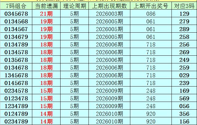 (1)在排列三已开出的7499期奖号中(统计截止第2026024期),目前7码组六遗漏值最大的组合为:0345678,本期遗漏21期;