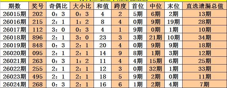 开奖回顾:排列三第2026024期奖号:268,定位直选遗漏值1期、2期、4期,遗漏总值为7期。
