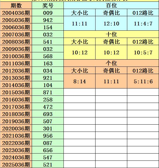 第036期历史同期开奖中,百位号码振幅分别为:9-8-1-5-5-5-4-1-9-8-7-6-2-2-1-2-6-9-6-1-0,波动范围在0-9之间,012路号码比例开出11:4:7,大小 号码比例开出11:11,奇偶号码比例开出12:10,本期预计百位开出奇数号码,参考号码9。