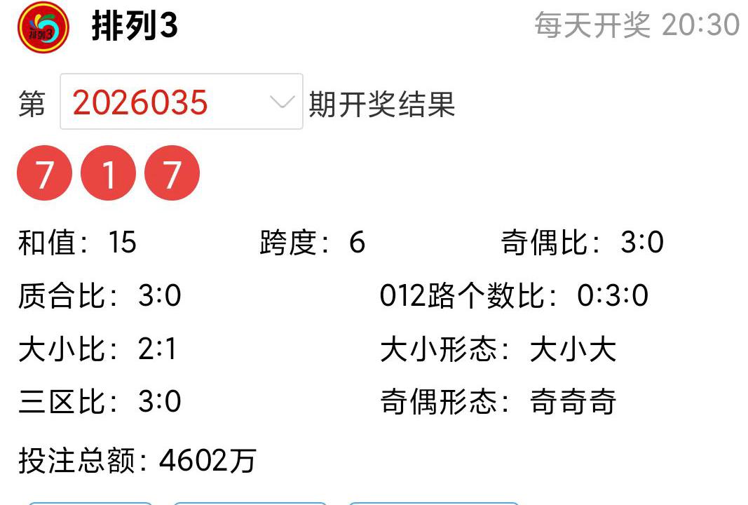 排列3上期开出三个奇数7、1、7,跨度:6,和值:15,奇偶比:3:0,质合比:3:0 ,大小形态:大小大,三区比:3:0, 012路个数比:0:3:0