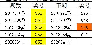 体彩排列三直选号码852历史上出现了5次,其下期分别开出奖号:295、648、166、021,统计如下表: