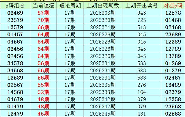 (5)排列三目前遗漏值最大的5码组六组合为:03469,本期遗漏87期,短期解冻的可能性较小,则26040期奖号分布在03469-12578之中的可能性最大。