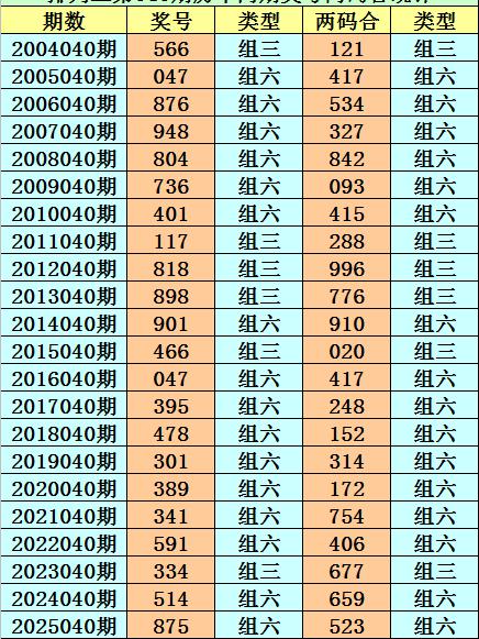 排列三从2004年开奖至今已开出7514期奖号了,其中第040期历史同期奖号出现22次,历年第040期分别开出号码:566、047、876、948、804、736、401、117、818、898、901、466、047、395、478、301、389、341、591、334、514、875。