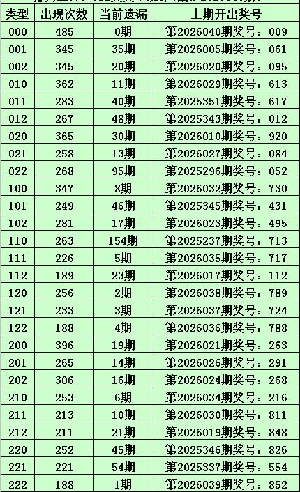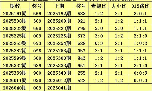 上期回顾:体彩排列三第2026040期开出奖号:009,其012路比为3:0:0,奖号012路类型为:000。