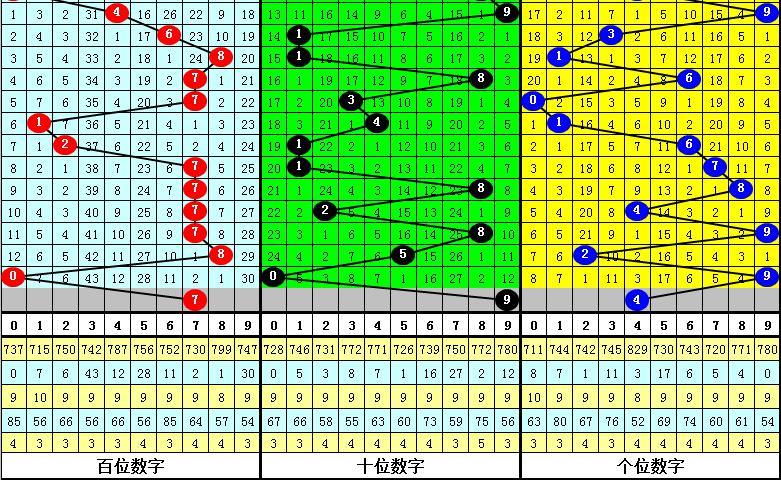 目前百位最冷号码为3,当前遗漏43期,该号码历史最大遗漏为56期,本期百位防号码3解冻。