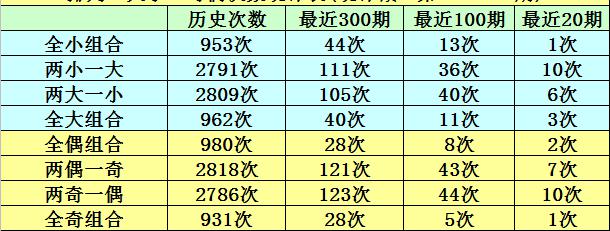 连续10期奖号中,两小一大形态开出4期,两大一小形态开出2期,全大形态开出3期,全小形态开出1期,本期大小形态判断:两大一小奖号。