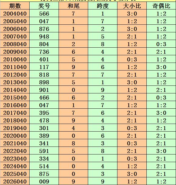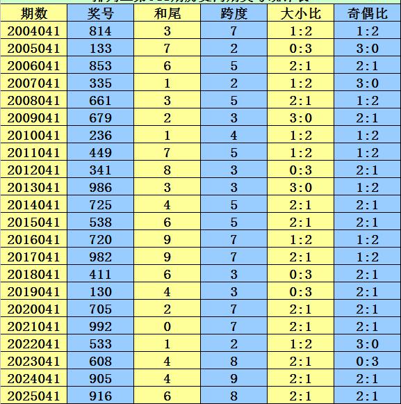 从2004年至今排列三已开出7515期奖号了,本期为排列三2026年第041期开奖,历史同期已出现22次奖号: