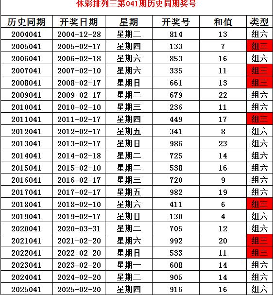 2026年2月10日排列三第041期开奖,历史同期分别开出奖号: