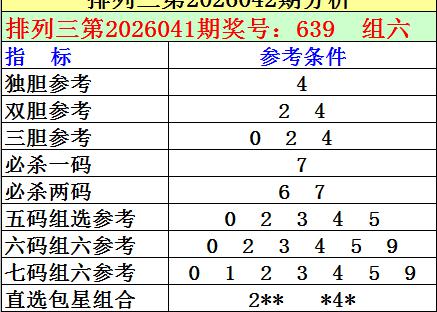 1.排列三最近十期分别开出号码:730-141-216-717-788-724-789-852-009-639,其中有8期奖号开出了上期的重复号码,本期防重号轮空,排除第2026041期奖号:639中的号码,关注号码:4。