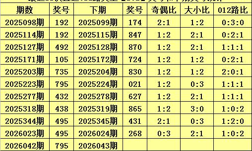 上期回顾:体彩排列三第2026042期开出奖号:795,其012路比为1:1:1,奖号012路类型为:102。