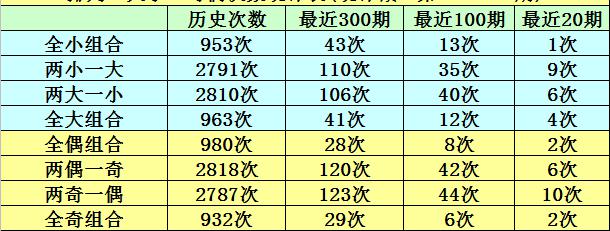 连续10期奖号中,全大形态开出3期,全小形态开出1期,两小一大形态开出3期,两大一小形态开出3期,本期大小形态判断:两小一大奖号。