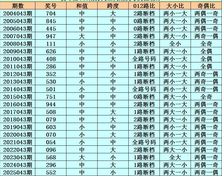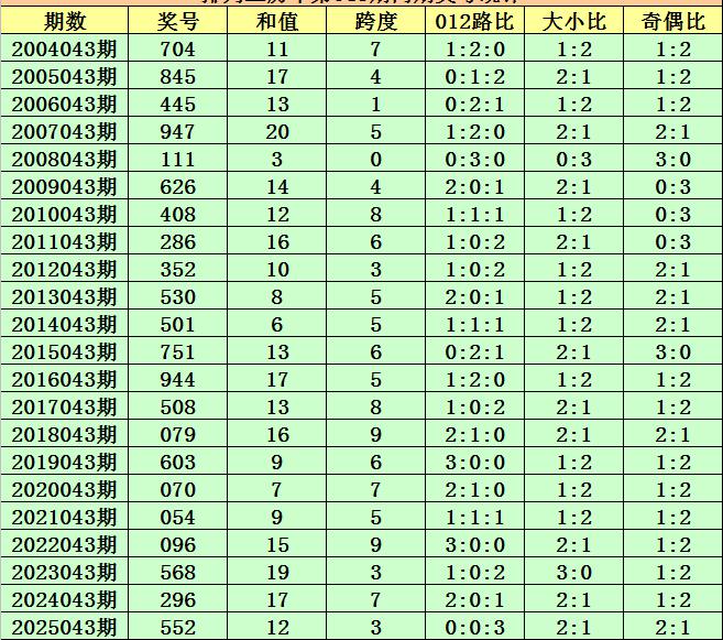 历史上第2026043期排列三已开出22期奖号了,历年同期奖号分别为:704、845、445、947、111、626、408、286、352、530、501、751、944、508、079、603、070、054、096、568、296、552,详细统计见下表: